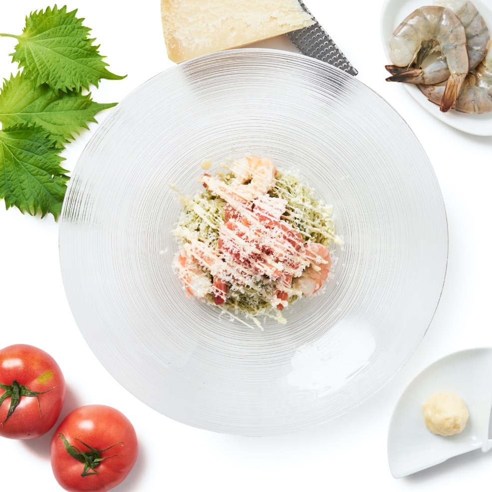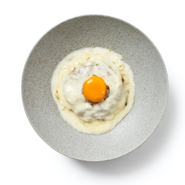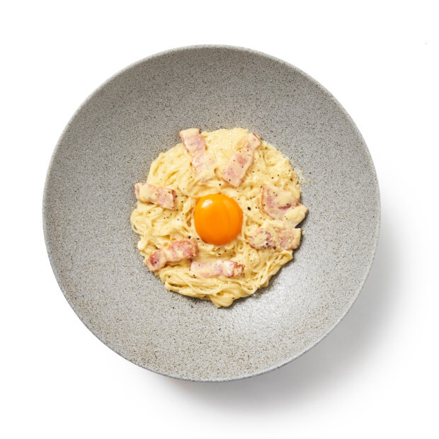 濃厚なクリームと青森県産じょっぱり卵を絡めたカルボナーラソースと細めのそうめんが