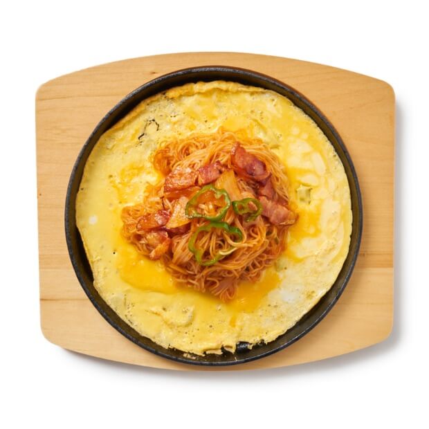 ふわふわの卵の上に懐かしさのあるナポリタン風味のそうめんが豪快に乗った一品。