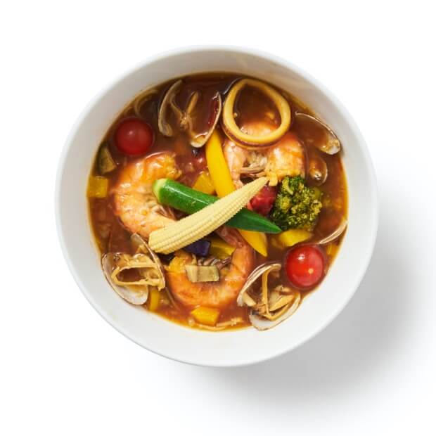 野菜と魚介の旨味が凝縮されたブイヤベース風のスープに彩り豊かな野菜と魚介がたっぷり乗った